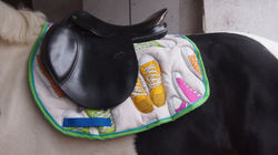Vidám, mintás, extra puha nyeregalátét, szegéllyel. Nagyon vastag, pufi és a belseje is polár anyagú, így a lónak is kényelmes.